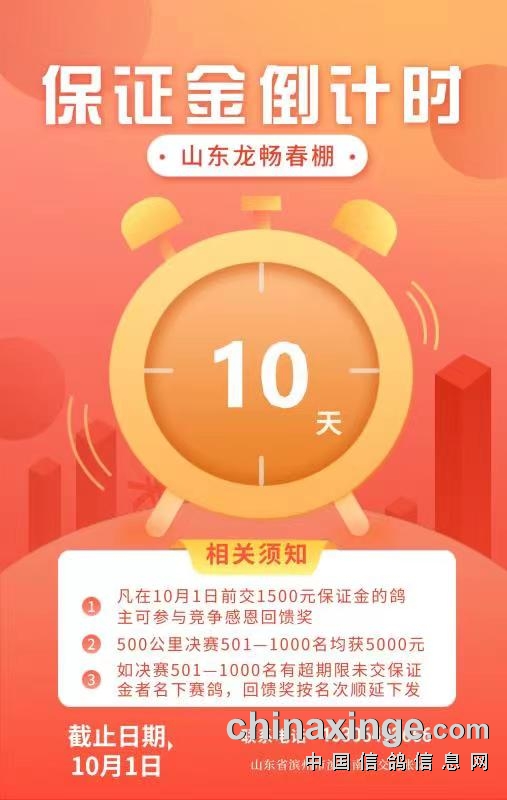 • 山东龙畅赛鸽(春棚)保证金回馈奖倒计时 (2021/9/27 22:18:00)