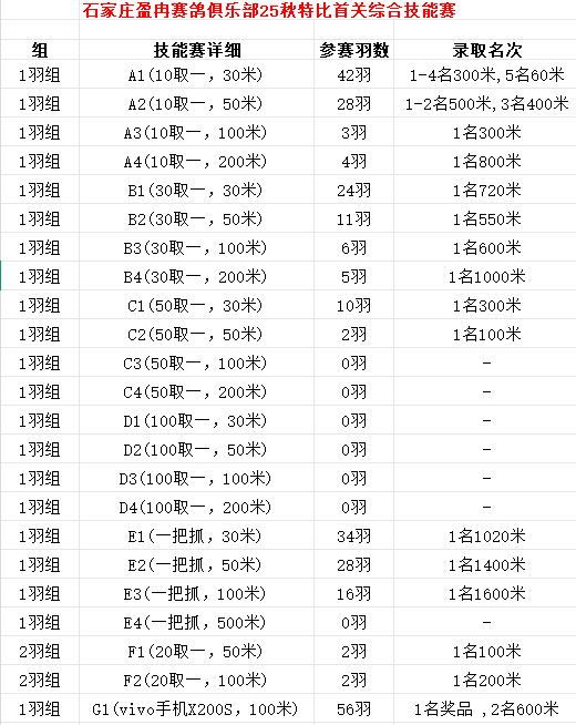 • 石家庄盈冉赛鸽俱乐部2025特比双关综合技能赛奖励明细 (2025/8/6 11:42:25)